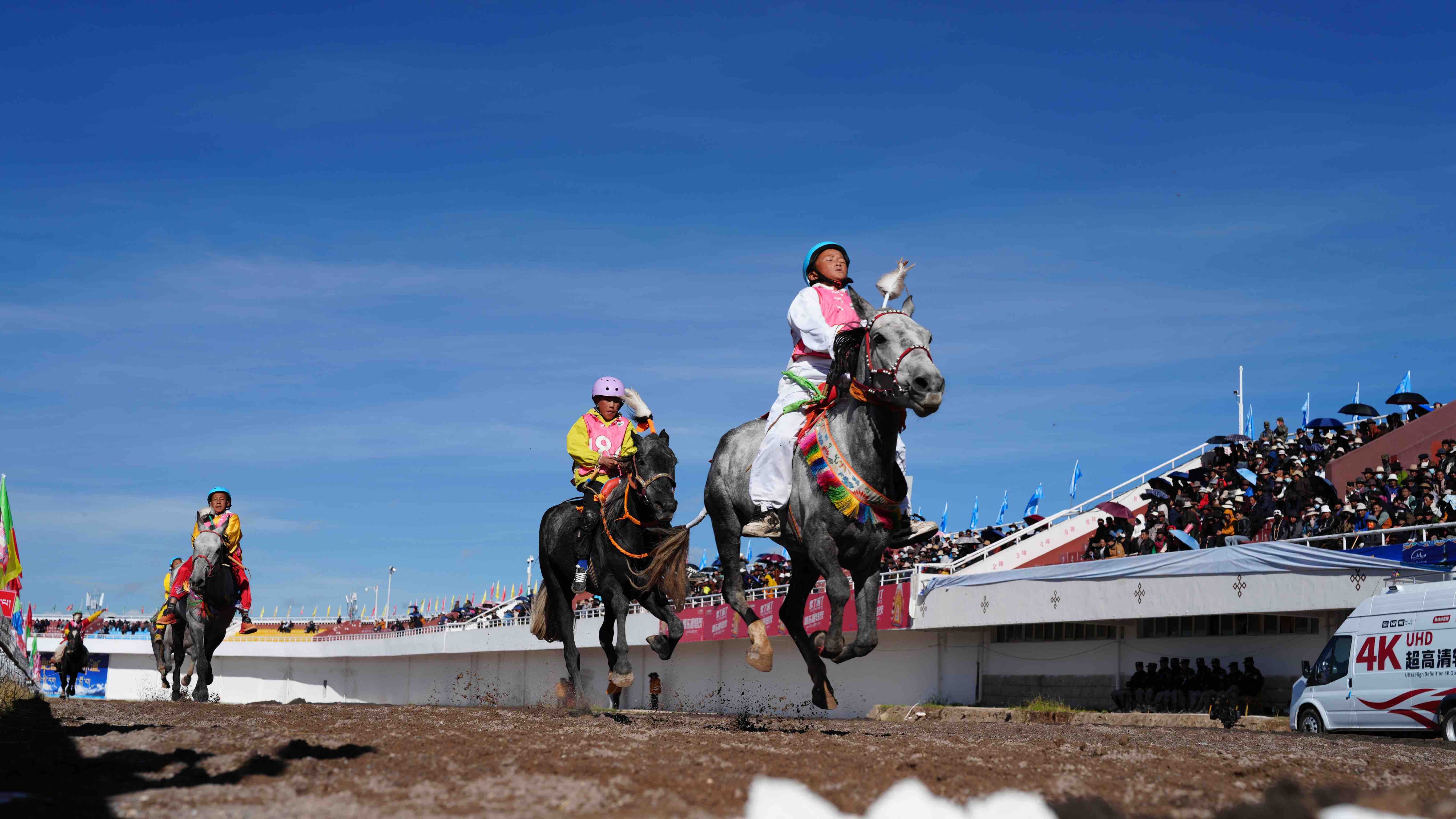 10:00,發(fā)令槍響驟然劃破草原的寧靜,場(chǎng)內(nèi)速跑8000米(1.45米以上超馬)決賽正式拉開戰(zhàn)幕。來自比如縣夏曲鎮(zhèn)165號(hào)騎手與駿馬“玉珠色南”如一道銀色閃電疾馳而過,率先沖線。馬主貢嘎與旺青眼含熱淚望向仍在喘息的愛馬——這是他們?nèi)陙砻咳赵诤0?000米以上高原堅(jiān)持晨訓(xùn)的成果。164號(hào)“玉珠雷電”與196號(hào)“玉馬”分列二三名,賽場(chǎng)上的每一次揮鞭、每一次沖刺,都是對(duì)高原騎手毅力與技藝的極大考驗(yàn)。